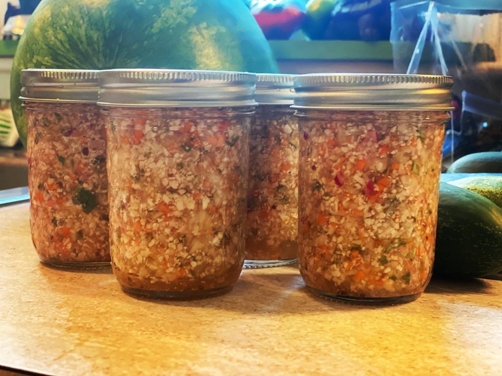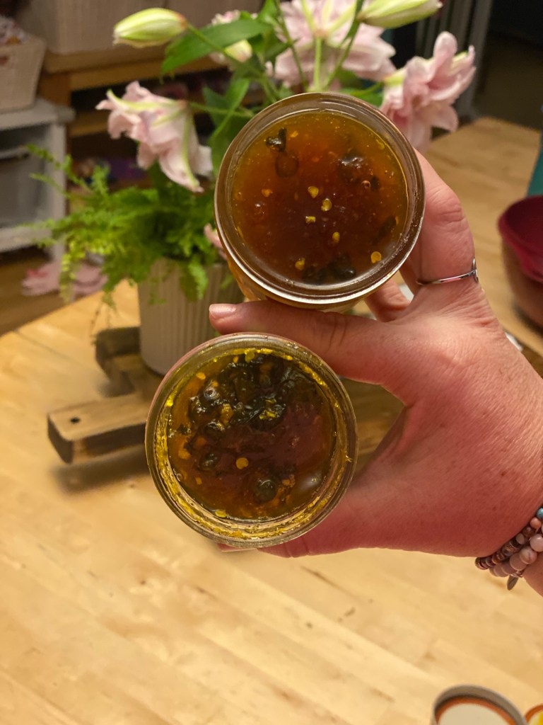 So it turns out that adding the pineapple and cooking it down basically made candy. I essentially made a spicy pineapple caramel… And then poured it over my jalapeños and into glass jars. I didn’t taste it because it was boiling hot and then…kids. I let it cool a while and stuck it in the fridge. The next day my best friend came over to visit and bring me flowers. I gave him a sampling of all the things from my garden is recently pickled. There was a veggie relish, pickled rainbow radishes, 1/2 sour pickles… and my new sauce and pineapple candied jalapeños. I tried to open it and scoop some out and it was like cold taffy! Oh man!! What an enormous disappointment that was. He kindly tasted and gave me honest feedback. We both agreed it would be good if it wasn’t an enormous failure!!! lol