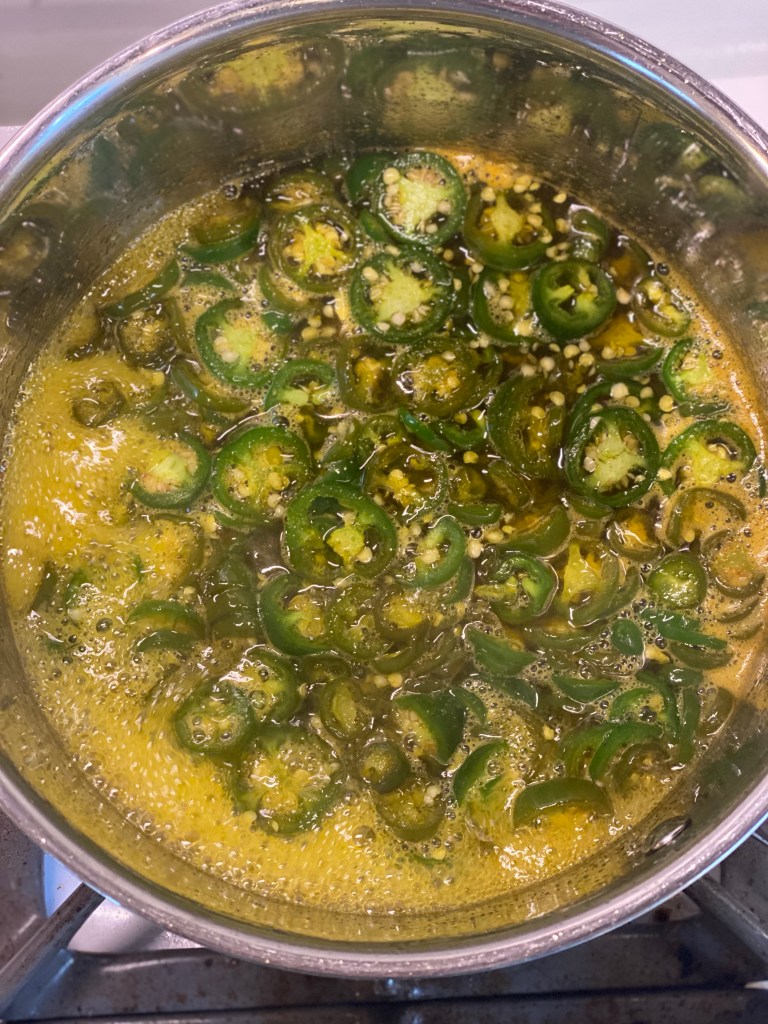 Then I add a teaspoon of turmeric and a pinch of salt. When it boils I add the sliced jalapeños. Boil for about 5 mins or so and then scoop out the cooked jalapeños into a clean mason jar. Continue boiling the liquid for another 5-10 mins until it thickens up a bit.