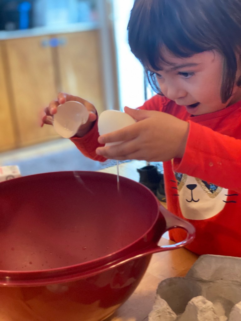 So back to Pearl. She needs lots of sensory experiences. And to be involved as much as possible. I knew I had a lot of cooking ahead of me. So I set her up with some projects. First she cracked a dozen eggs for me. She did so good. She was so proud!