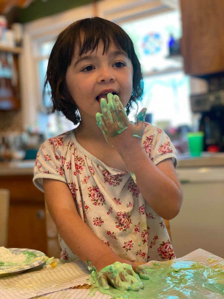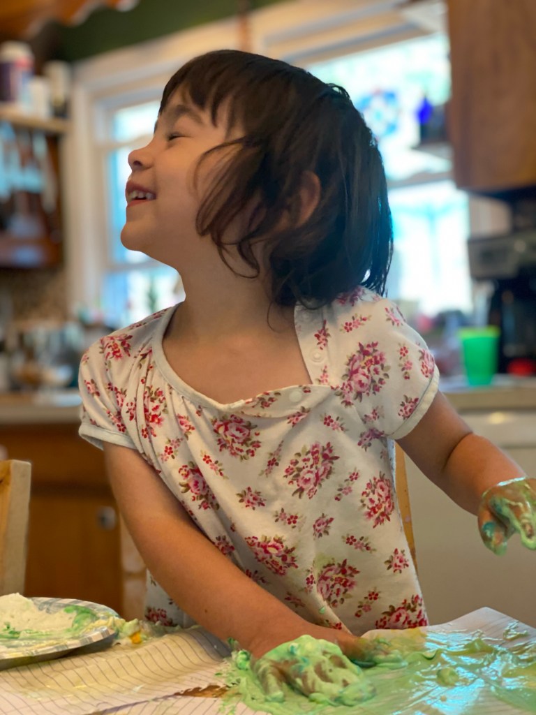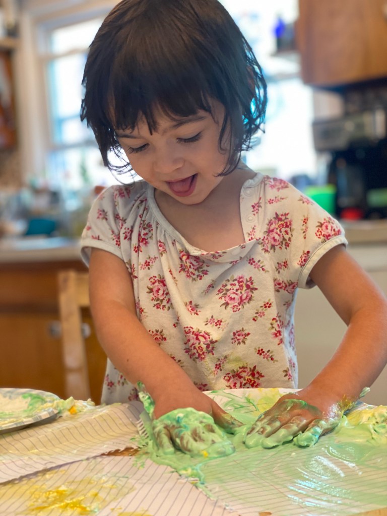 Her next special project was finger painting with rainbow whipped cream. I filled a paper plate with whipped cream and drops of food coloring. I gave her a bunch of paper and let her explore with her hands and make hand prints. And let’s be honest: she made body paint.