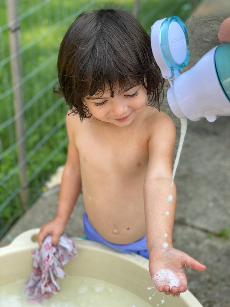 Ok so now that she was covered in rainbow whipped cream we had phase two of this project. Water table to the rescue!!! I filled the table with water. Duh. Then I filled a bottle with dish soap and water and shook it up hard to make soapy foam. She enjoyed having the foamy bubbles poured in. She mixed it all up with her hands and arms.