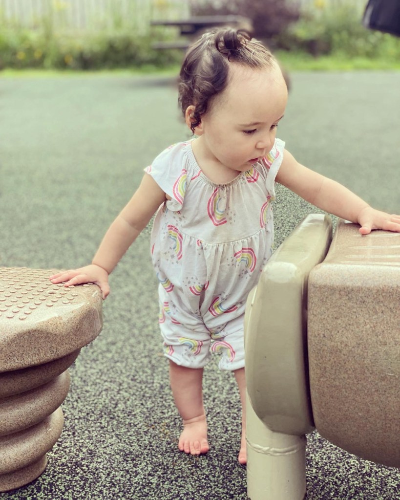 Don’t judge. This poor child doesn’t have any shoes yet. She’s not walking yet. But she wanted to stretch her legs too!