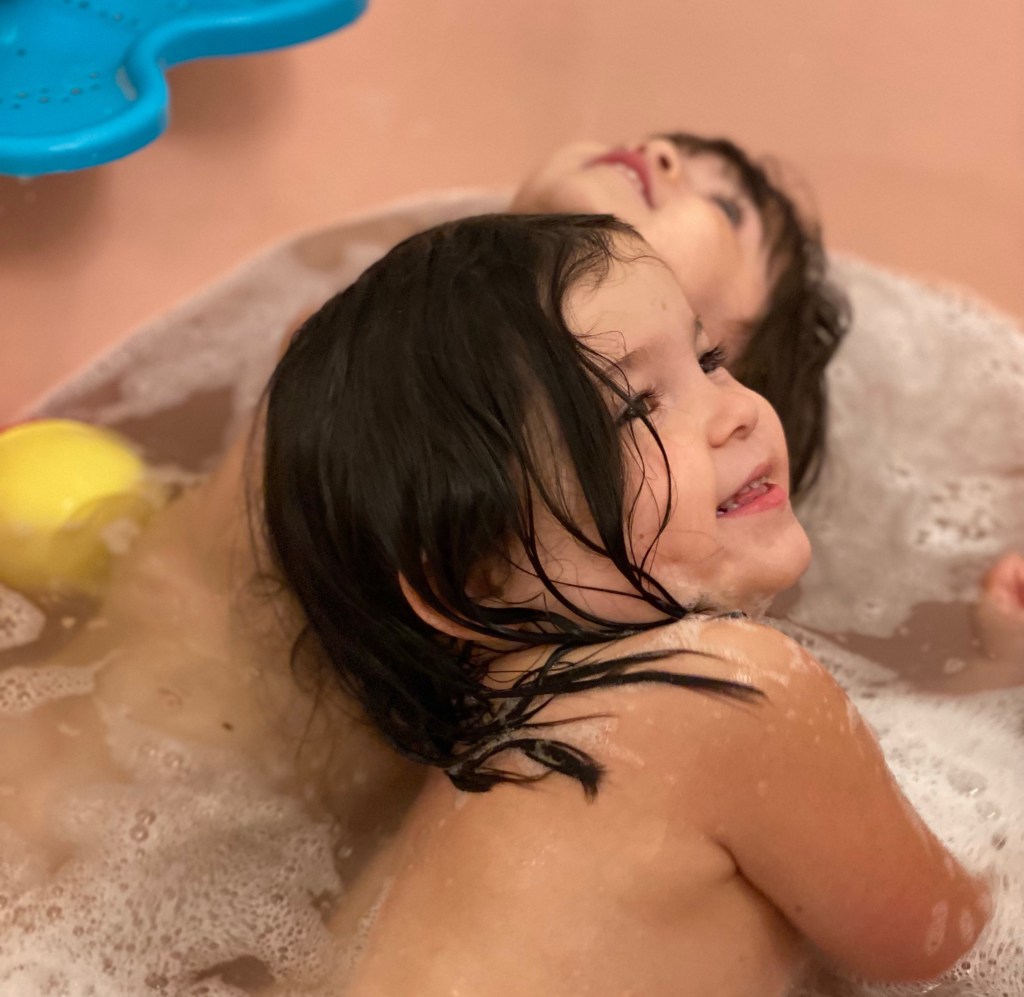 Bubble bath + scratchy slime + a twin sister to play with = life