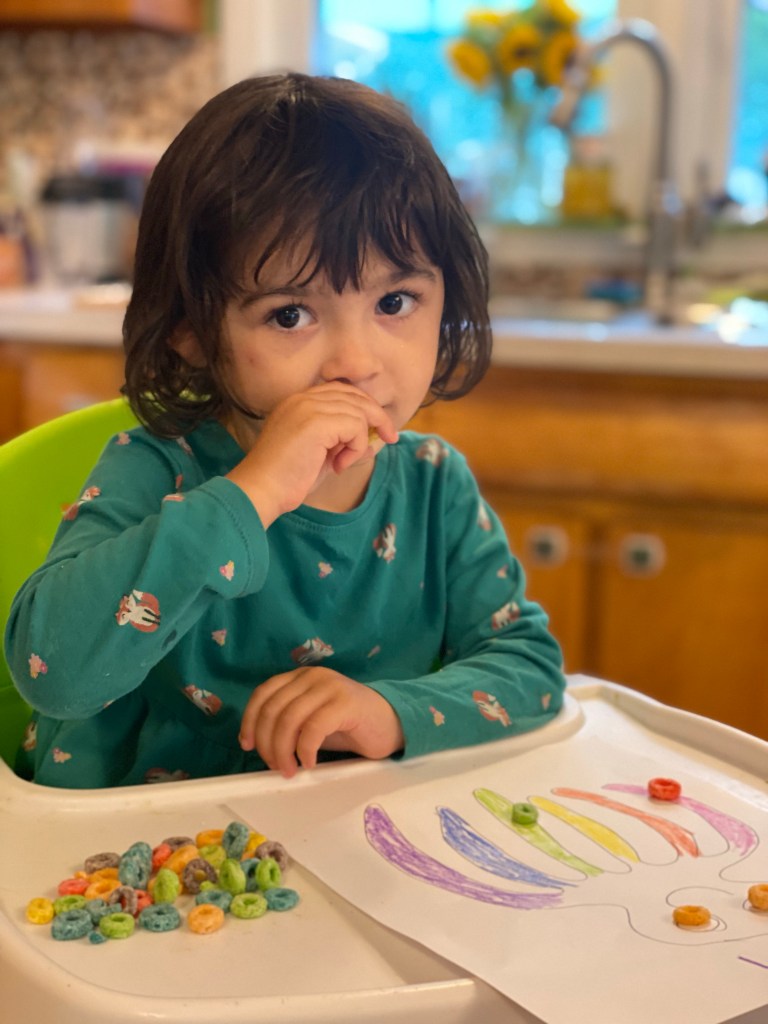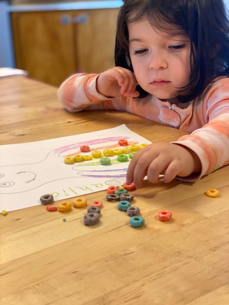 I don’t typically buy “colored” foods if I can help it. I LOVE colors. But in food… no thanks. I bought fruit loops (froot loops?) recently for some projects though. We’ve had more fun with that box of cereal!!! This week I drew them all a squid character with rainbow tentacles they had to match fruit loops to.
