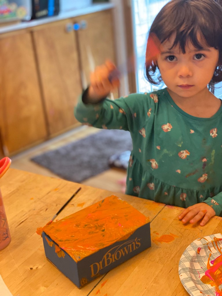 See the paintbrush in motion? This was moments before a Pearl meltdown. As I took this picture she flung all the paint and her treasure box onto the floor. That was fun…