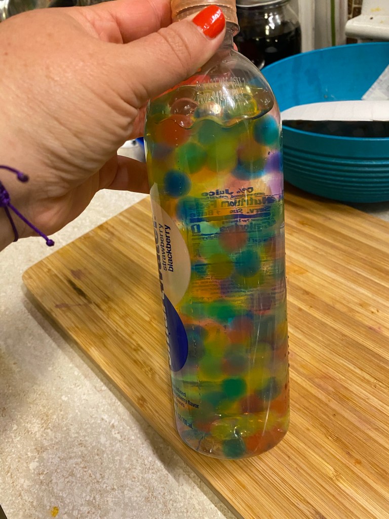 The twins needs lots of activities and ways to explore. I love making them sensory tables. This week I made a few bottles of water beads. We set up the water table with bubbles and water beads and a bottle of shaving foam! I let them get naked and go to town playing with all the textures!!! They loved it! Naturally it lead to another bath! lol