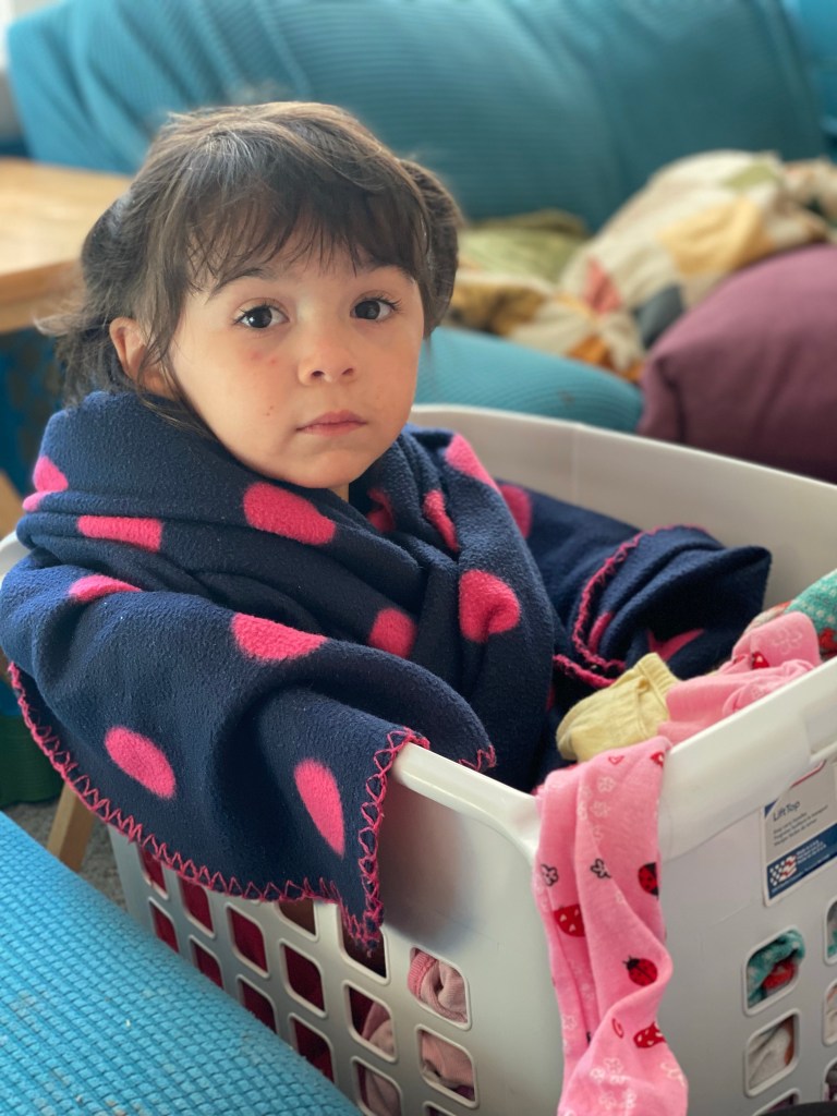I try to peck away at laundry when they watch tv and dinner cooks. Today I had a couple helpers. This one made herself nice and cozy in my basket! Then had t the nerve to tell me I was putting too much laundry on her!