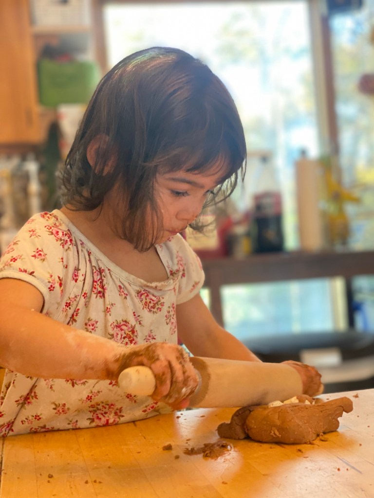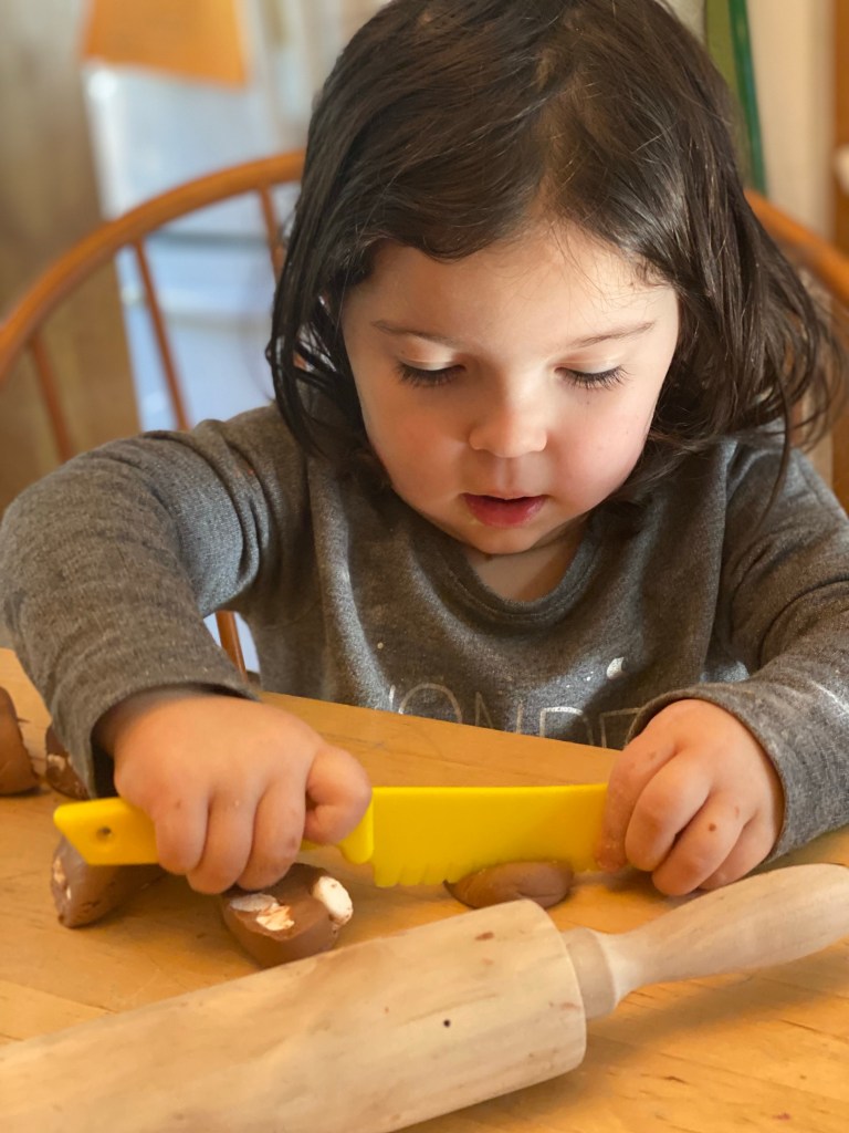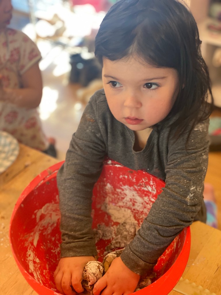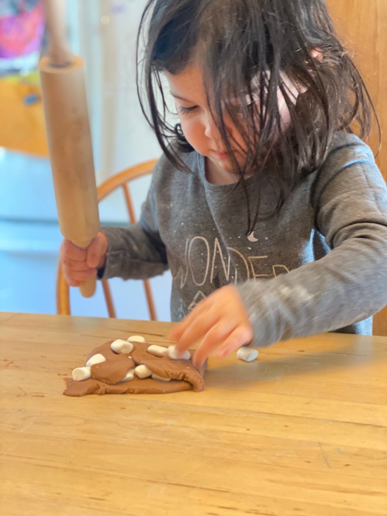 After we rolled the marshmallows in we made logs of dough and each girl cut rounds of dough that looked like cookies! We pretended to bake them and put them on plates!
